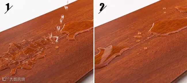 这款地板表面的瀑布纹,中等光泽度的低温搭配高光水痕质感的麻点,反差出春日瀑布下落的水汽晕开在小溪水面的波光粼粼,活跃了整个世界。在渗水性测试和耐污性测试中,此款地板也表现良好。