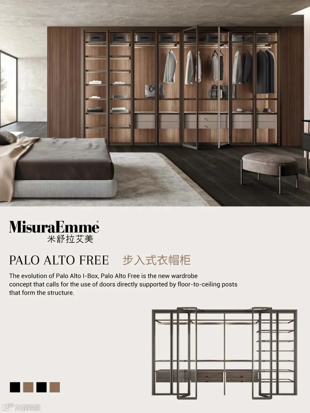 定制衣柜已成为潮流趋势,它不再只是一个收纳空间,更是品质生活的领航者。MisuraEmme主打私人定制,对材质细节、精致线条和饰面的不断探索,巧妙地呈现出一个简约、优雅又具艺术质感的空间。精心设计的Palo Alto Free 步入式衣帽柜氤氲着低调奢华感,让人可期的理想生活,近在眼前。