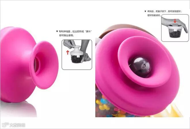 这款储物罐看似很普通,其实特色在于它罐盖的设计。独特设计专利的罐盖,向上拉的时候会发出“POP”一声,罐盖就会形成一个漏 斗,即可将食物倒出,拿取很方便。用完,把罐盖按下去即可密封罐子,阻止食物受潮,保持食物新鲜。