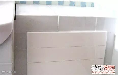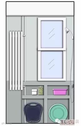 第一部分是窗台下的小隔断,下面放洗脸盆、墩布桶,这类东西特别影响装饰效果,一般应放在门后能遮挡的地方,但这个卫生间也只能放在这里。原来的设计是两层(如下图):