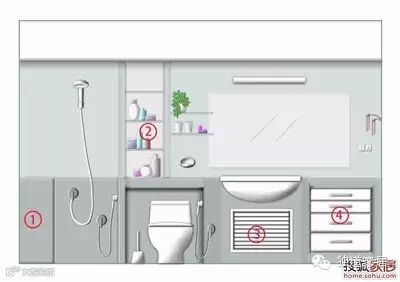 老妈家就有一个收纳功能特别强大的卫生间,这个卫生间的收纳分为五个部分(见下图),下面分别介绍。