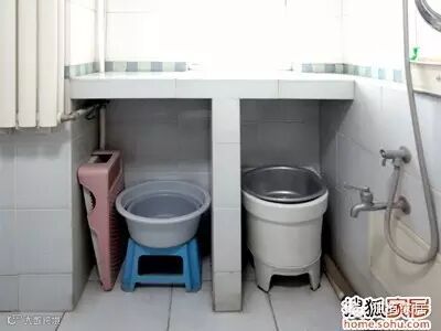 第三个收纳空间是洗面盆下,如果上面洗面盆的下水口对着地面的排水口,下面就可以打上隔断、放很多东西。但老妈家洗面盆的下水口与地面的排水口错开了,这个地方空间浪费很多,只能装一些不常用的东西(如下图):