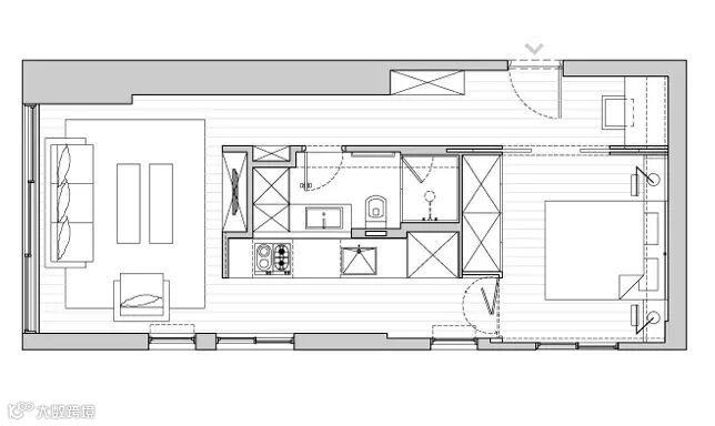 这样布局的最大好处,在于让卧室和客厅分别占着“一”字两头,休息空间与公共空间被完全分隔开来,互不干扰。