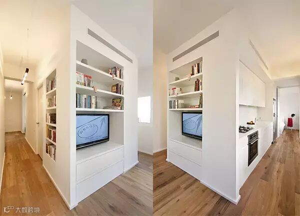 在北面的这一道墙(进门右手方向左手方向),是卫浴空间的入口以及一条长过道。横竖这个“一”字户型都需要走廊,对小户型而言,空间浪费就是犯罪,【空间大师】在这里把墙面利用起来,做了个五层的收纳架。