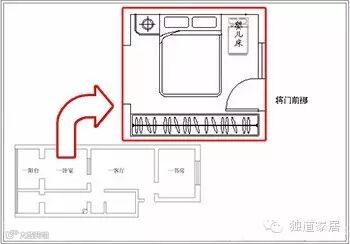 因为添人进口了,所以衣物用具也将增加,必须增加衣柜容量。两种方案,一是将常见衣柜设计高度提高,让它直到顶棚;二是增加面积,可以考虑将门前挪一段距离,增加门后的空间而多摆放一组衣柜。