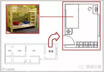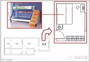 设计重点:书房变卧室,卧室里还要有上下铺床以方便保姆照料孩子;阳台变书房