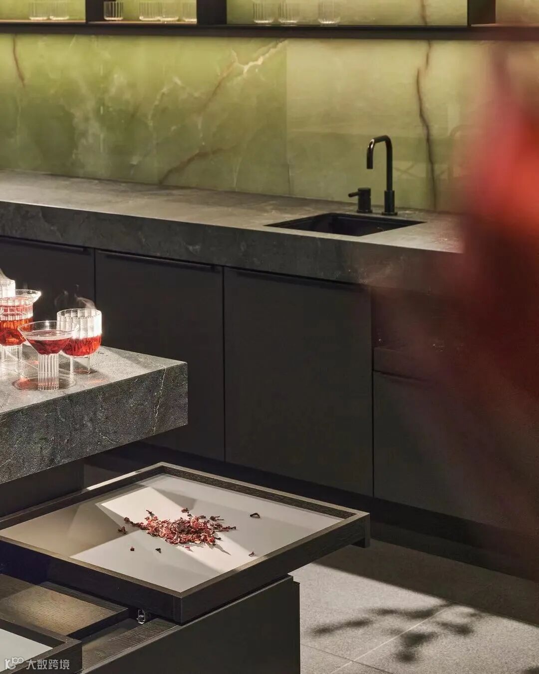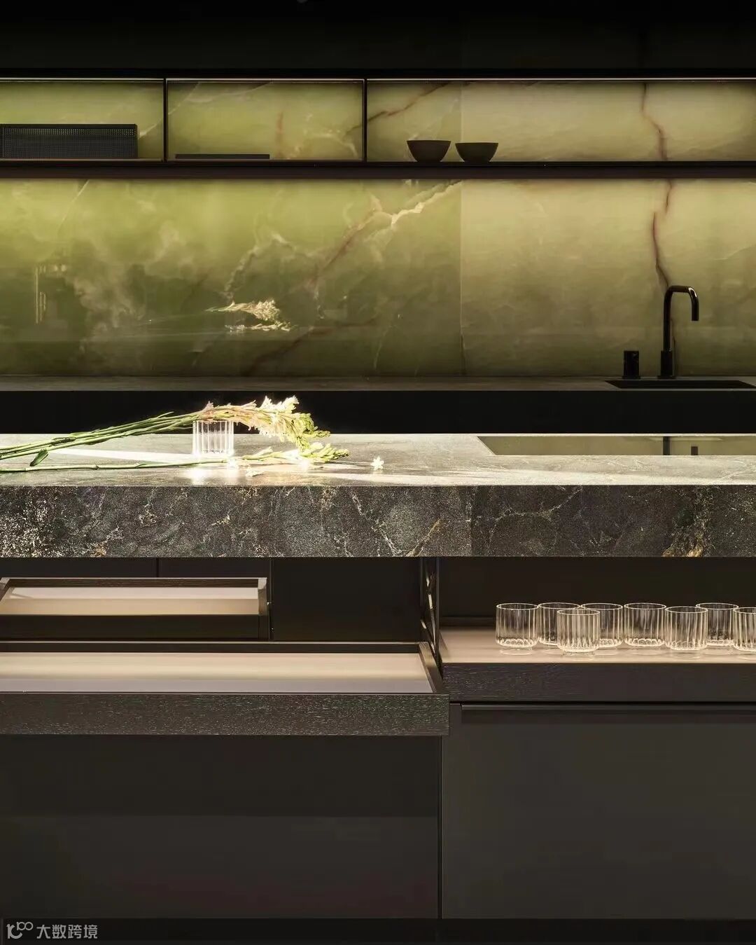 工作台、吊地柜间以及其他厨房墙体实现一体式石材材料搭配,是体现“高级感”厨房的关键设计点之一。本套厨房墙体选用亮绿色和红褐色独特纹理的天然缟玛瑙,带来双重魅惑,从墙面到操作台、中岛台,视觉上起到连贯性与舒适感,将高贵气质表现得淋漓尽致。
