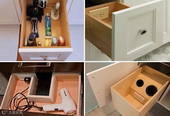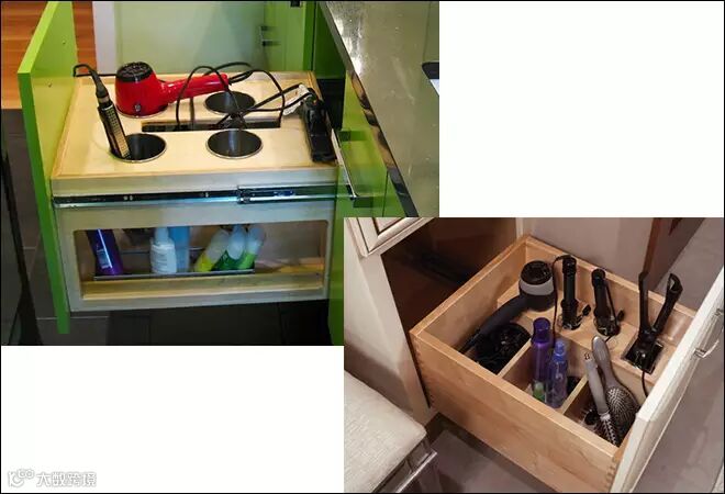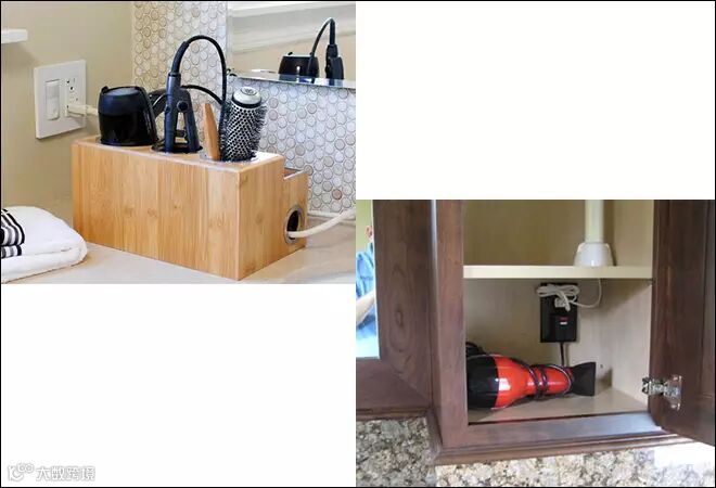 ▲这个方法最为简单,买个抽屉较多的浴室柜就好了。选定专门存放吹风机的抽屉,然后在里边安装一个小插座,省时省力,非常便利。