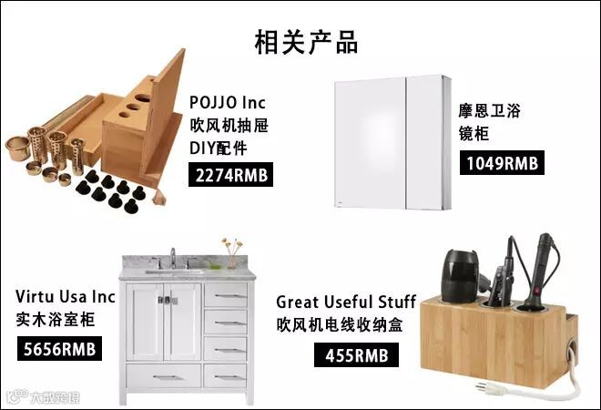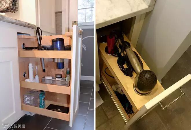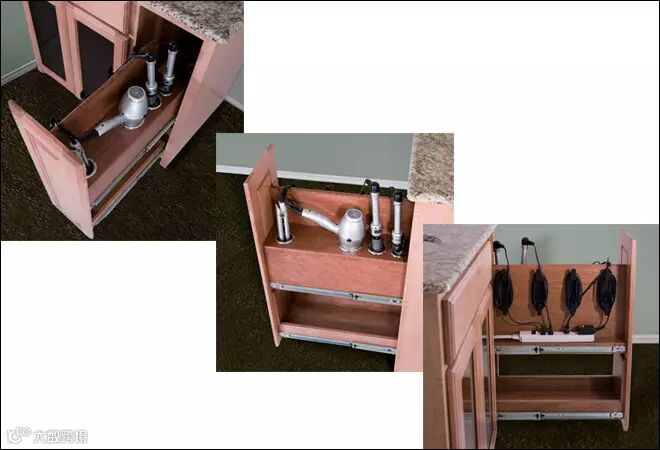 看了上面的案例,你可能会想,这些专门为吹风机设计的浴室柜,在国内不怎么多见,在哪里可以买到?呃,我可以说这是歪果仁自己私人定做的吗?不过,国外很多商家都有卖“DIY吹风机抽屉”的一些五金配件。在美国Houzz官网上就有得卖,如下图所示▼