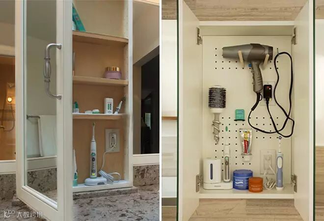 一个问题就是,镜柜可以轻易收纳电动牙刷这种小物件,但是收纳吹风机就有点难度了。要像案例中把吹风机挂在镜柜里边,还需要自己购买网板、挂钩等五金配件进行DIY。