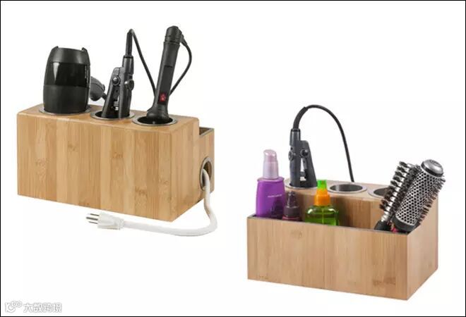 其实,如果仅仅是想收纳浴室小电器(吹风机、卷发棒等),买个电线收纳盒是最方便实用的。在美国Houzz官网就有卖,英文名叫“Hair Styling Station”(发型设计站),下面这一款售价$69.99,竹纤维做的。