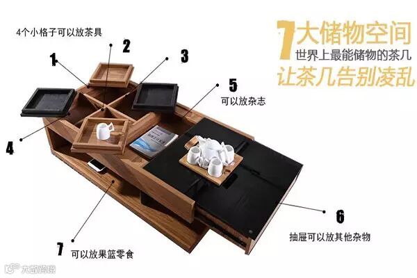 这款茶几上部的四个小格子可以放茶具,旁边大块空间可以放杂志,下部可以放果篮零食,绝对是一款为好客的你准备的茶几!