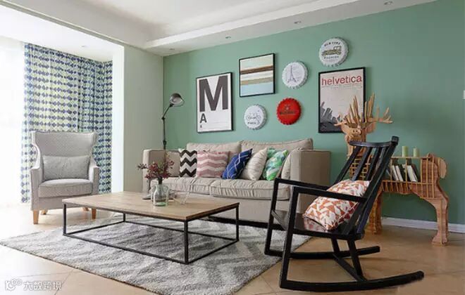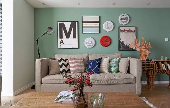 沙发和茶几都是经典的美式款式,但是沙发选择了浅灰色,压住了复古的地砖。沙发背景墙选用了北欧风的装饰,简单的白色系的挂画和瓶盖造型的装饰物,当中再穿插一个正红色的瓶盖型装饰,既不单调,又很显眼。