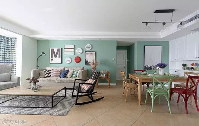 这套案例的户主,一开始是奔着Harbor House式的简约美式去的,很中意美式那种温馨随意的氛围,但到中期的时候开始审美疲劳,一是觉得大部分美式都像是一个模子里刻出来的一样,二是Harbor House式深色的家具对于年轻人来说总是有点过于稳重,于是目光开始转投轻快的北欧风。可是当时硬装已经过半,美式的复古砖都已经铺贴完成,而北欧风的家具大都是尖尖细细的脚,很难压得住美式的复古地砖。所以最后还是选择了经典美式的家具,但是颜色上选了非常淡的原木色,并在软装上混搭一些北欧风的元素,于是有了现在这五彩斑斓,被父母戏称是儿童乐园的成品。
