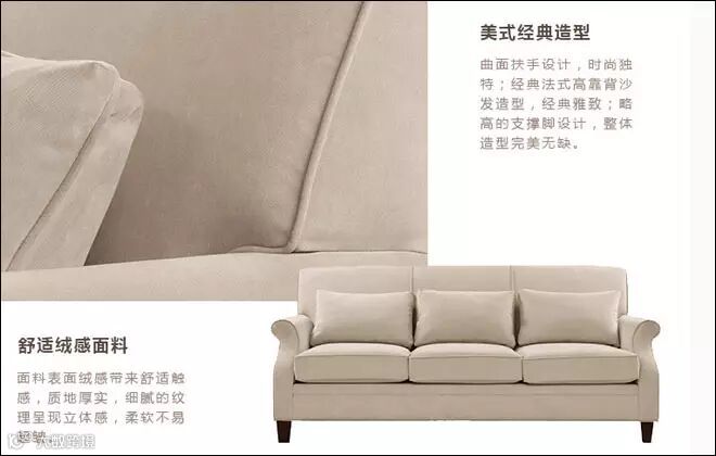 这款沙发曲面扶手设计,加上高靠背的沙发造型,和略高的支撑脚设计,是经典的美式沙发款式。沙发用实木做的框架,稳定性不错,比较耐用。面料是平绒布的,触感比较舒适,带一点暗暗的条纹,加上嵌条的勾边,比较有立体感。