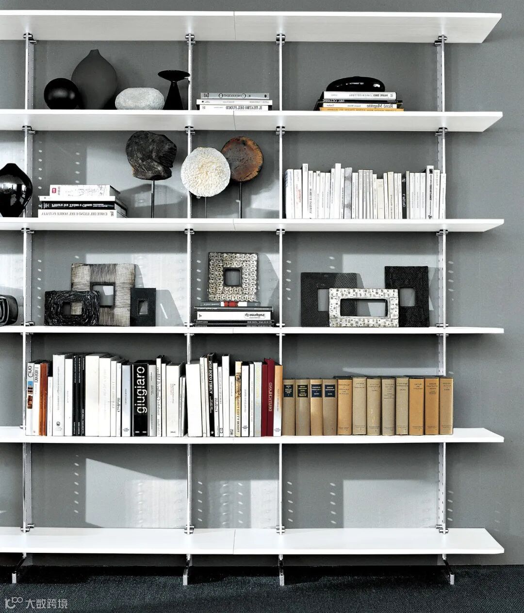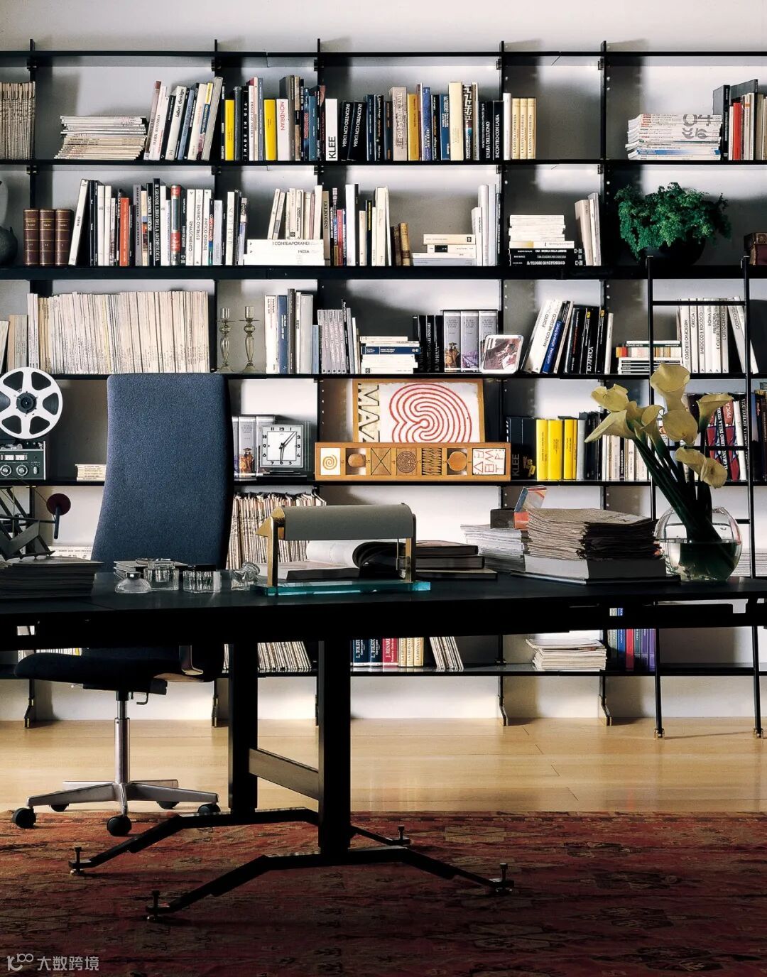 这款书柜是1949年的经典复刻之作,铝制直线型框架有着精准的40毫米间隔钻孔,搁板架可根据需求调整间隔大小。电镀合金底座和黑色漆面交相辉映,典雅大气。整个书柜没有背板,在视觉上打开了空间的格局,书籍陈列其上,为生活增添了一份仪式感。
