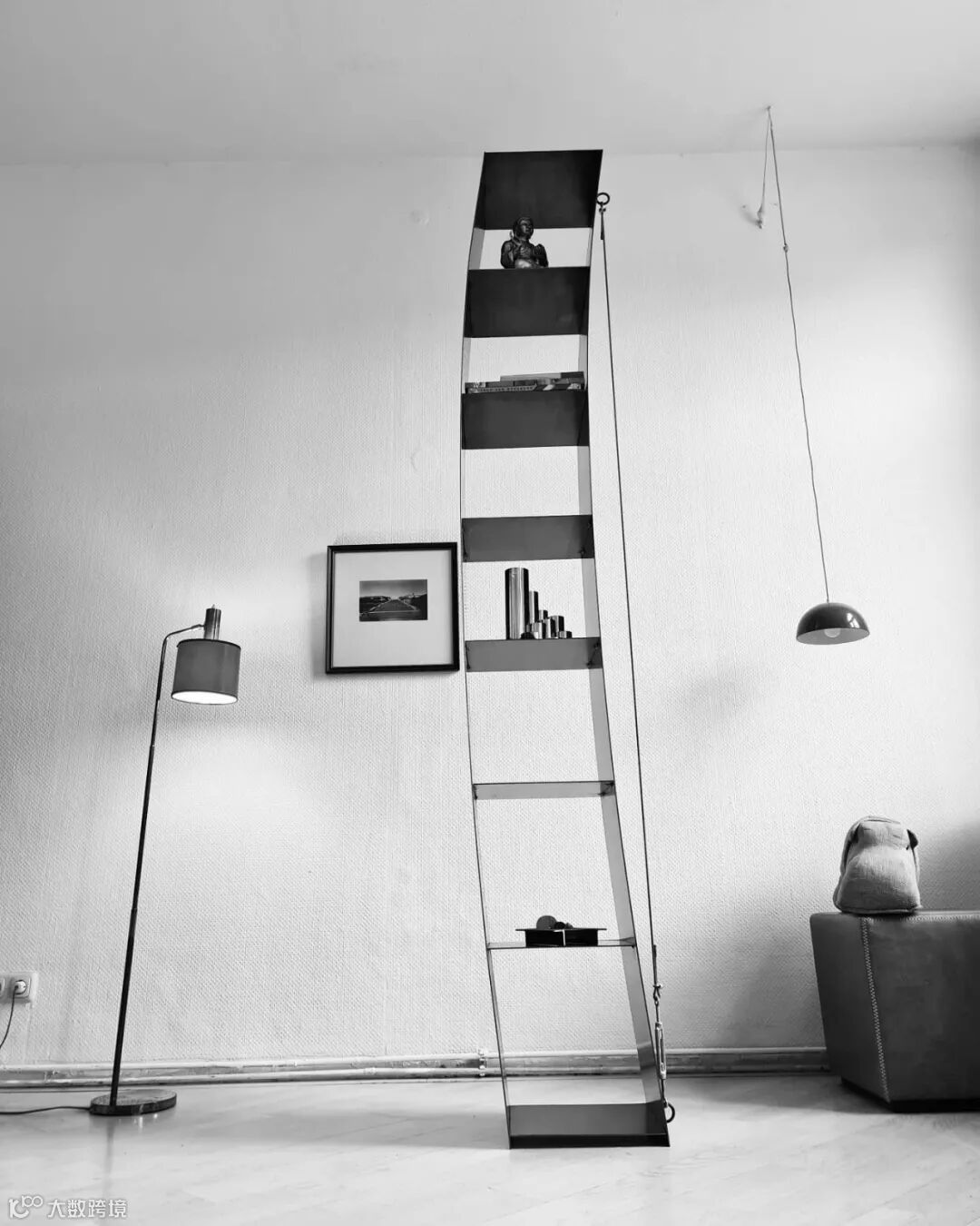 书架高2295mm,深度为310mm,3毫米的原钢隔板作为书架的整体结构,得以实现设计师脑洞大开的创新设计。刚硬的金属材质构建柔和的书柜曲线,呈现出一种柔中带刚的奇幻效果。侧面的矫直钢索,洗练精细,对比之下,传达出妙趣横生的视觉氛围。