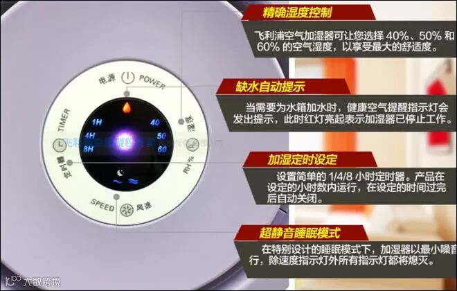 这款加湿器的特点是采用数字用户界面,比较好操作,有智能数字传感功能,可以的进行湿度控制,可以选择40%、50%和60%的空气湿度。与超声波加湿器相比,可以减少细菌散布,当然,价格也高了不少。这款加湿器还有1、4、8小时的定时功能,睡觉时候也可以使用,且可以调节成睡眠模式,加湿器运行时的灯亮度会降低。