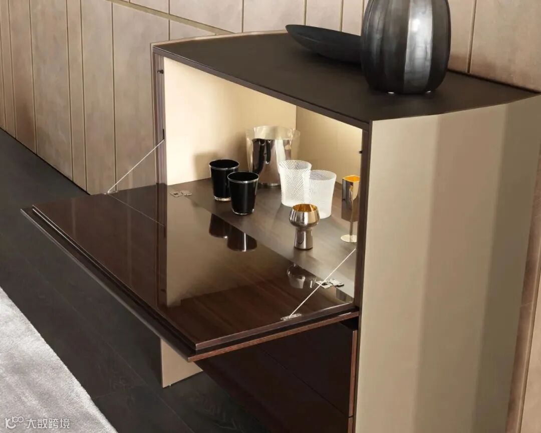 在日常的使用过程中,可以将不重的物品摆放在打开的柜门上,充当临时台面,下翻门以其独特的造型和空间适应性,为边柜增添了设计感和时尚感。
