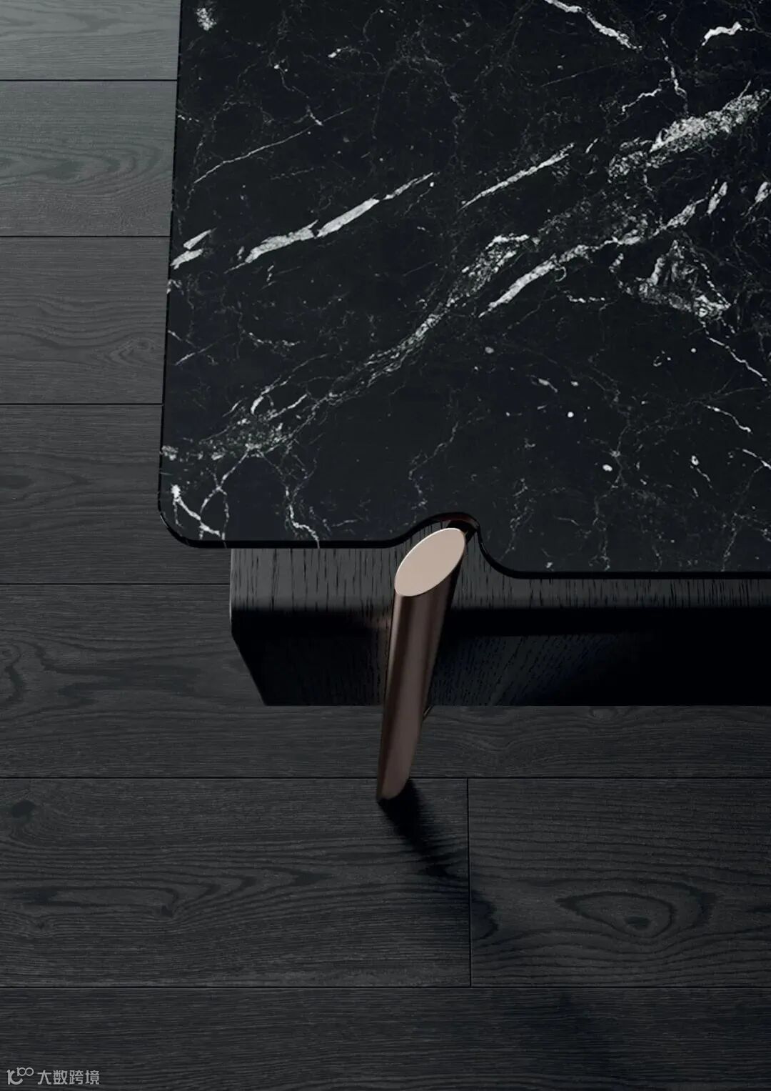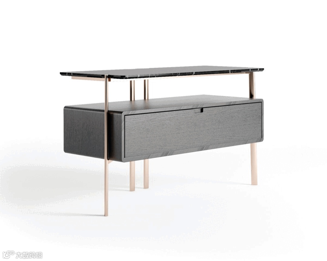 Eros边柜设计有一个黑色橡木抽屉柜,其特点是金属、大理石、珍稀木材等不同材料之间的呼应衬托。