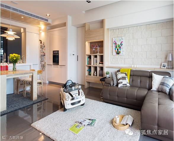 简约北欧风色调为基础,加上生活多了两个小孩,家里更需要活动区域,运用开放式规划,整合区域使用,连结客厅与餐厅,孩子便能自由奔跑,就连在家开小车也没问题。设计师另外提醒木作柜体部分,像电视柜、玄关柜等,最好以切斜角方式收边,形成圆弧边角,避免孩子奔跑游玩时危险碰撞。