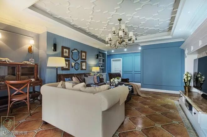 蓝色搭配橙色系的窗帘,显得整个空间更加闲适。