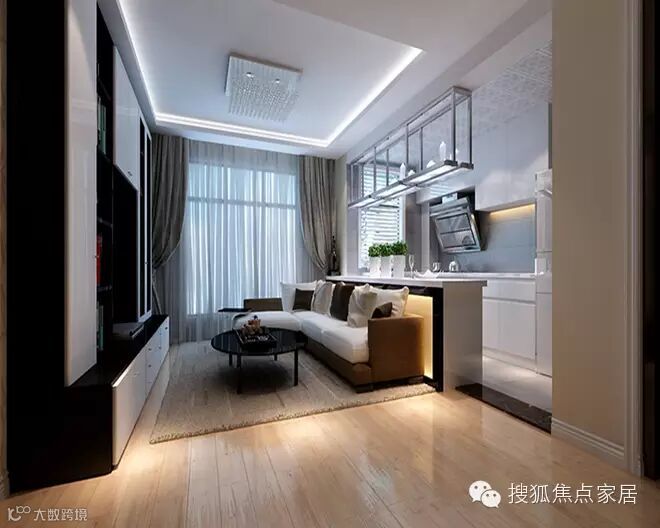 客厅效果图:在这个方案中设计师根据户型空间、采光、通风、功能的局限性将厨房的墙体拆除用敞开式厨房来提高整个起居室的采光及空间延伸性。