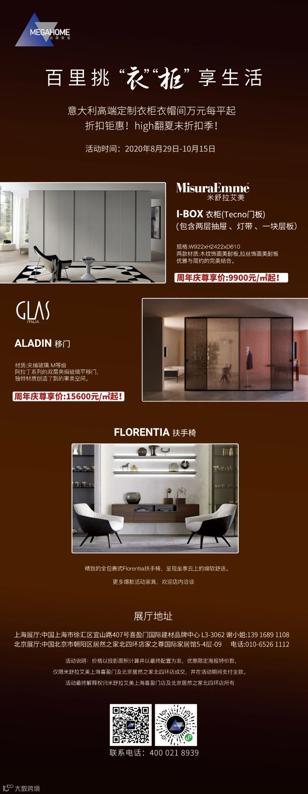 旗下意大利高端定制家具MisuraEmme米舒拉艾美和国宝级玻璃系统门具品牌Glas Italia将以定制衣柜和移门系列产品让利回馈。