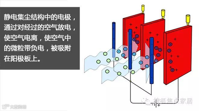 静电集尘:静电集尘多出现在混合式空气净化器上。当空气经过净化器内部的静电集尘部件时,在高压电场的作用下发生电离,正离子被集尘格栅中的阴极电板吸收,空气中的微粒则被带上负电,向阳极板放电,被吸附在阳极板上,达到过滤空气中微粒的作用。这种方法净化效率很高,但是净化速度相对较低、在工作中可能产生臭氧,且不能过滤有毒气体,如甲醛等。