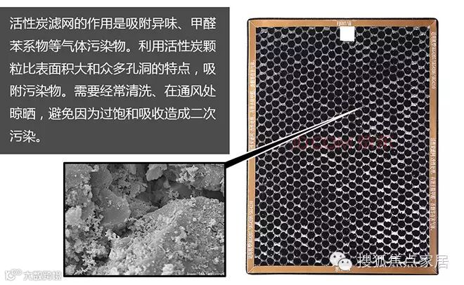 HEPA滤网:HEPA滤网时高效空气微粒过滤的英文缩写,这层过滤网的主要作用是高效过滤空气中的微小颗粒物。HEPA滤网只有0.5-2μm直径的孔径,对0.3μm直径的颗粒物的过滤效果需达到99.97%以上。一般的HEPA滤网为了有更好的过滤效果,大多采用多层和折叠的方式增加滤网的表面积。虽然HEPA滤网能有效过滤微小的颗粒物,但是对空气中的有机污染物或异味等几乎不起任何作用。