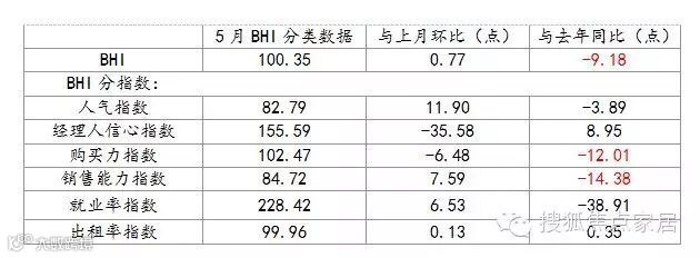 由商务部流通业发展司、中国建筑材料流通协会共同发布的全国建材家居景气指数BHI 5月份全国建材家居景气指数(BHI)为100.35,环比上升0.77点,同比下降9.18点。全国规模以上建材家居卖场5月销售额为933.2亿元,环比上升9.84%,同比下降14.51%。1-5月累计销售额为4062亿元,同比下降4.82%。