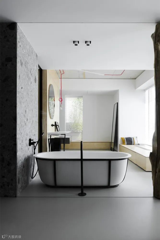 浴缸采用极致纯白的底色,线条流畅,铺叙至简,缸体外部环绕黑色管状不锈钢支撑结构,构筑了整体的参差感,丰富了卫浴空间的视觉层次和结构层次,传达出轻松愉悦的美学韵律。