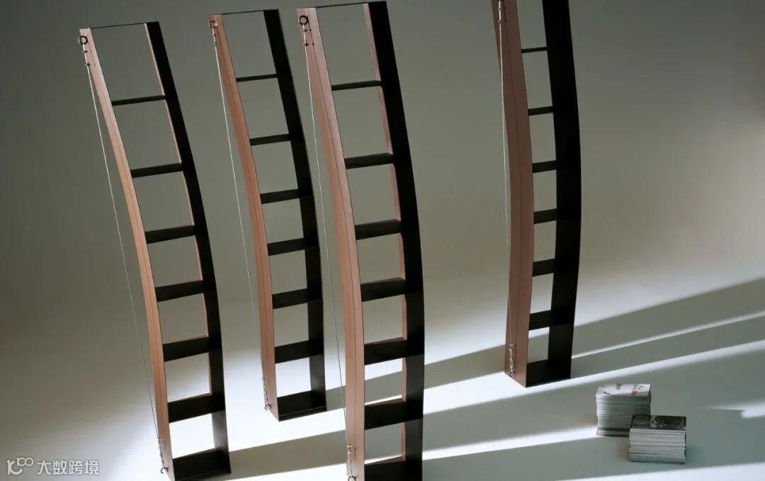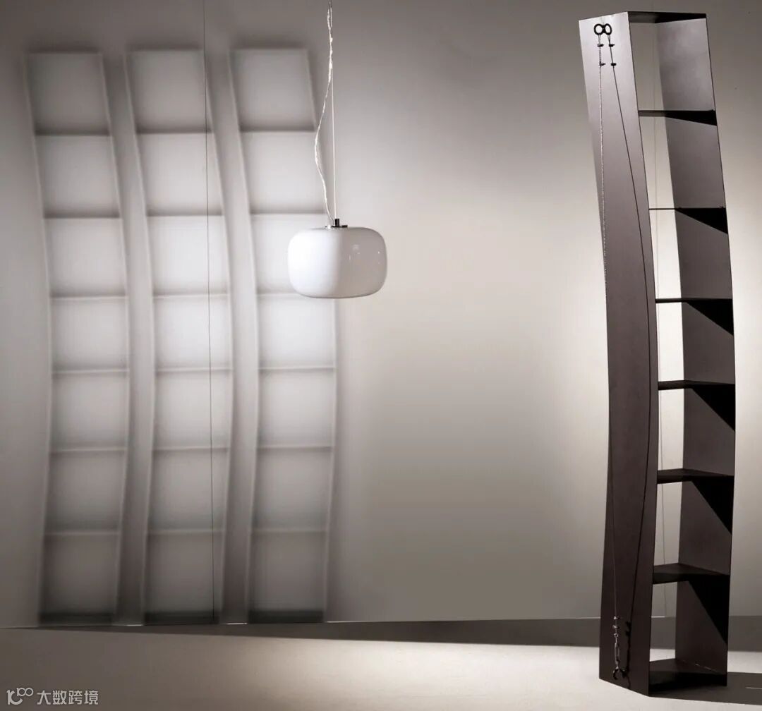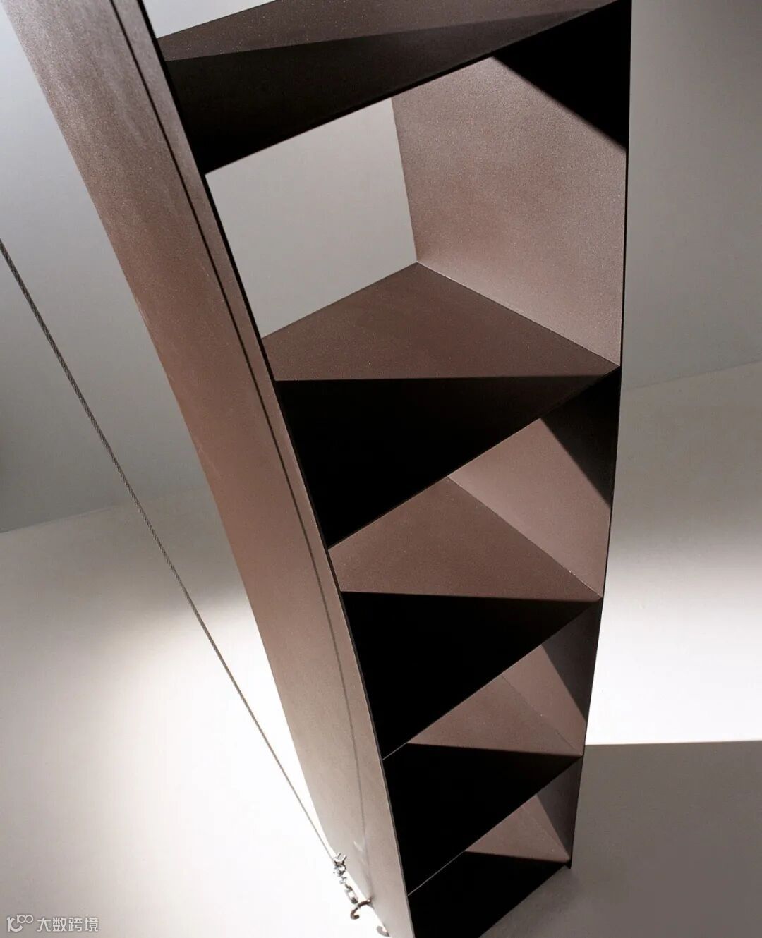 书架高2295mm,深度为310mm,3毫米的原钢隔板作为书架的整体结构,得以实现设计师脑洞大开的创新设计。刚硬的金属材质构建柔和的书柜曲线,呈现出一种柔中带刚的奇幻效果。侧面的矫直钢索,洗练精细,对比之下,传达出妙趣横生的视觉氛围。