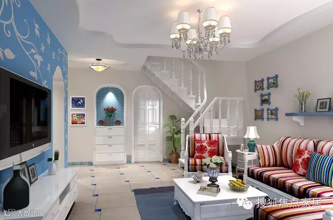 整个客厅空间本不是很大,在色彩的运用上选择蓝白色主次分明,垭口融合了地中海风格元素最终让业主十分满意。 楼上小厅打造成精致的书房。