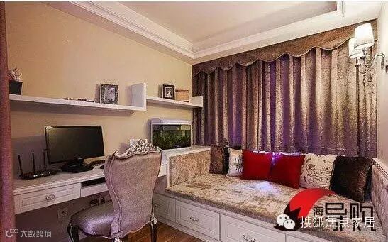 深紫色的布艺,榻榻米设计,很适合浪漫的小夫妻。