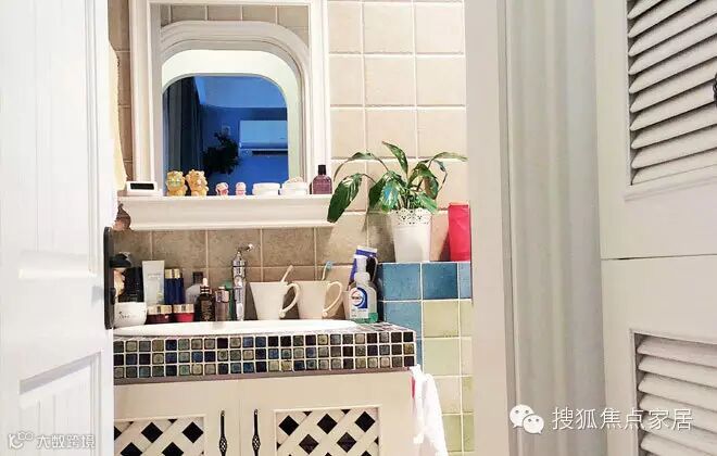 厕所也同样将瓶瓶罐罐放在空隙处,不要忘记摆上一盆绿植哦。