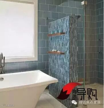 同样是墙面+玻璃的隔断,上面安置了隔板,正好可以放沐浴用品。