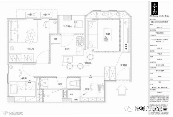 空间格局:客厅、厨房、书房、主卧室、小孩房、储藏室、工作阳台
