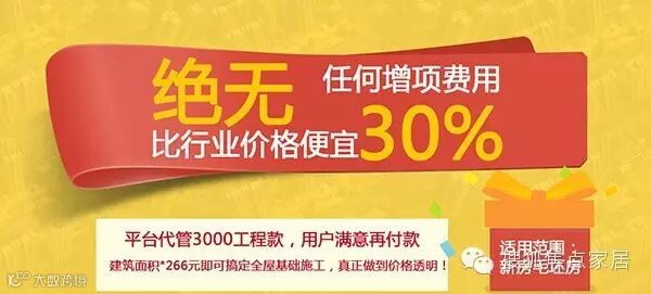 为吸引和服务更多的业主和用户,搜狐焦点家居推出全网跳楼价基础施工钜惠套餐!推广期每平仅需266元(全屋基础施工15项标配项目),比行业价格低30%。(适用范围:新房毛坯房)
