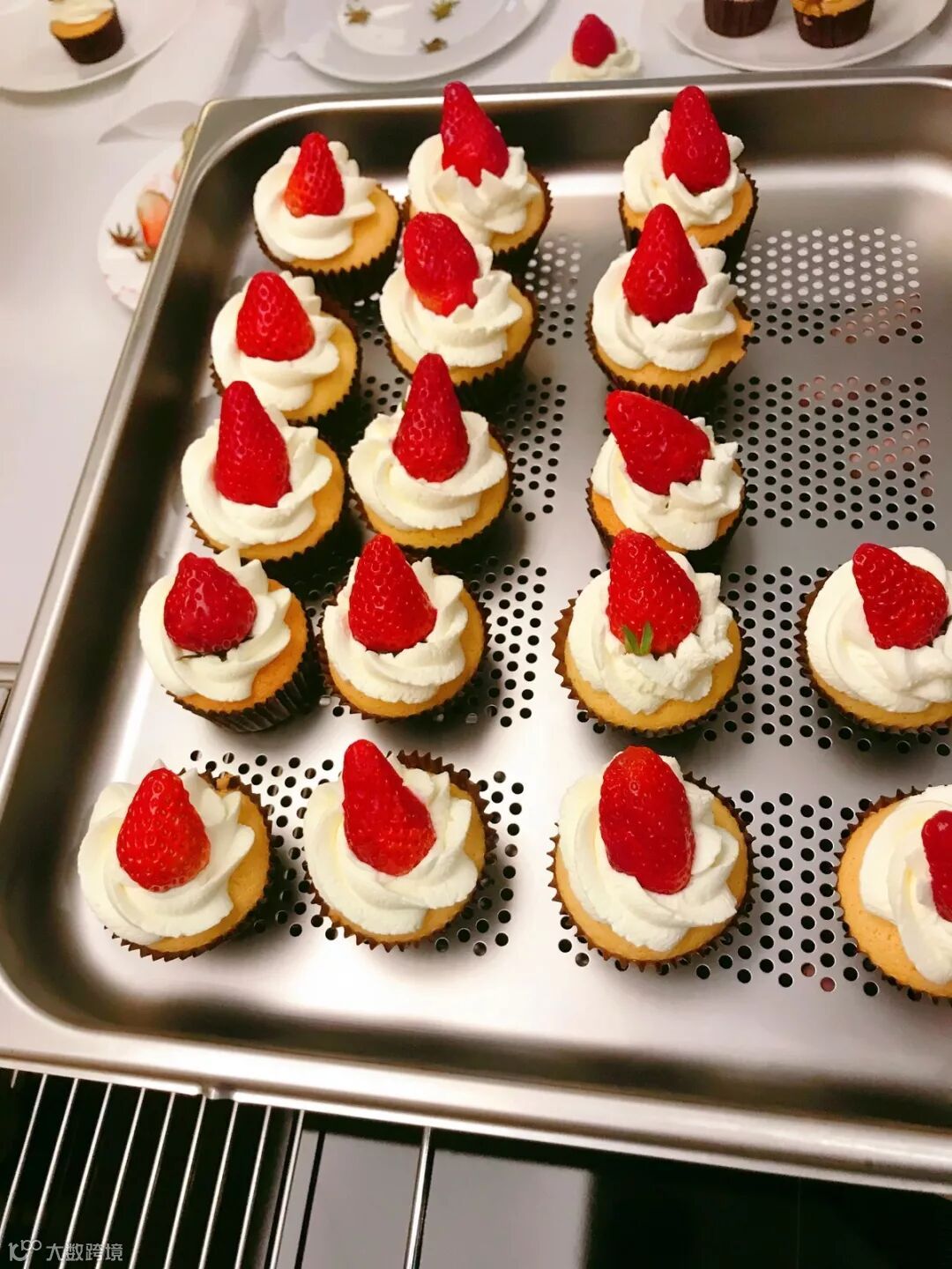 经过裱花(奶油)、加上草莓后,精致的成品完成了,大家欣喜不已,相互比较品尝,好一派热闹,大家不仅增长了烘焙知识和操作技能,还体验了DIY操作的快乐。