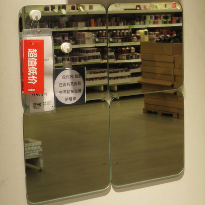 四块正方形的镜子,可以贴在墙上。竖着贴就是一个穿衣镜,2*2贴就是一个梳妆镜。它还有防碎设计,即使打碎了,玻(jie)璃(cao)渣也不会碎一地。