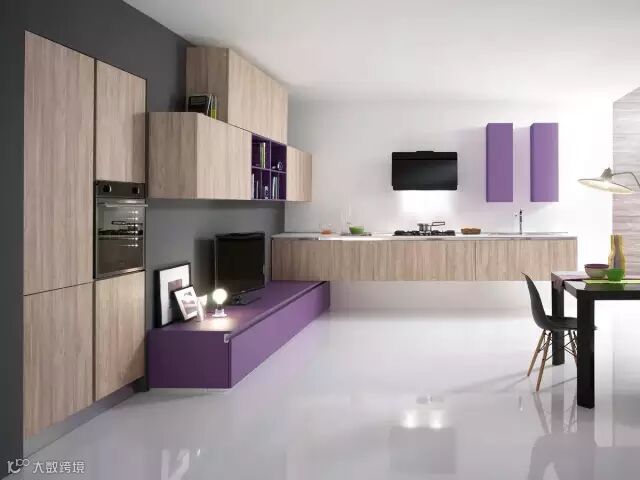 橱柜与电视柜像乐高一样交叠,再点缀优雅的紫色,整个空间充满生活趣味。