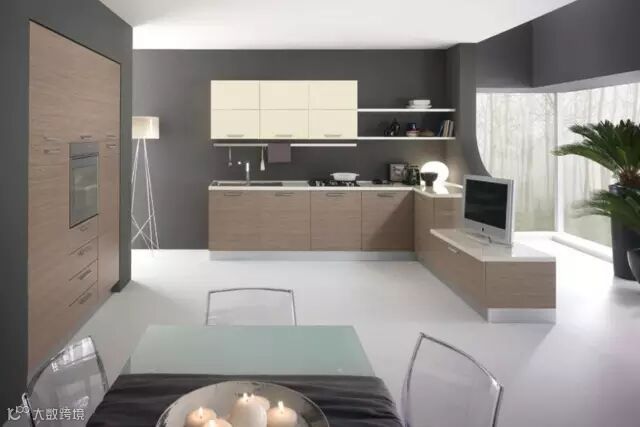 橱柜靠边设计,连接着的电视柜充当了隔断的功能。阳台空间打通,大大的落地窗,美景尽收眼底。