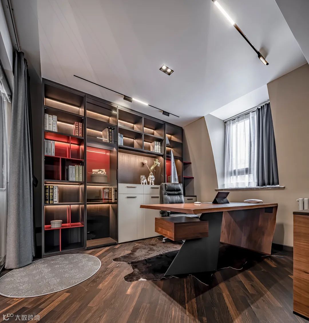 拾级而上,就到了二层。书房撇弃过去的厚重与传统,以开放式简洁书架为背景,配以几何造型书桌,以丰饶的创意表达出生活的内涵和当代气质。