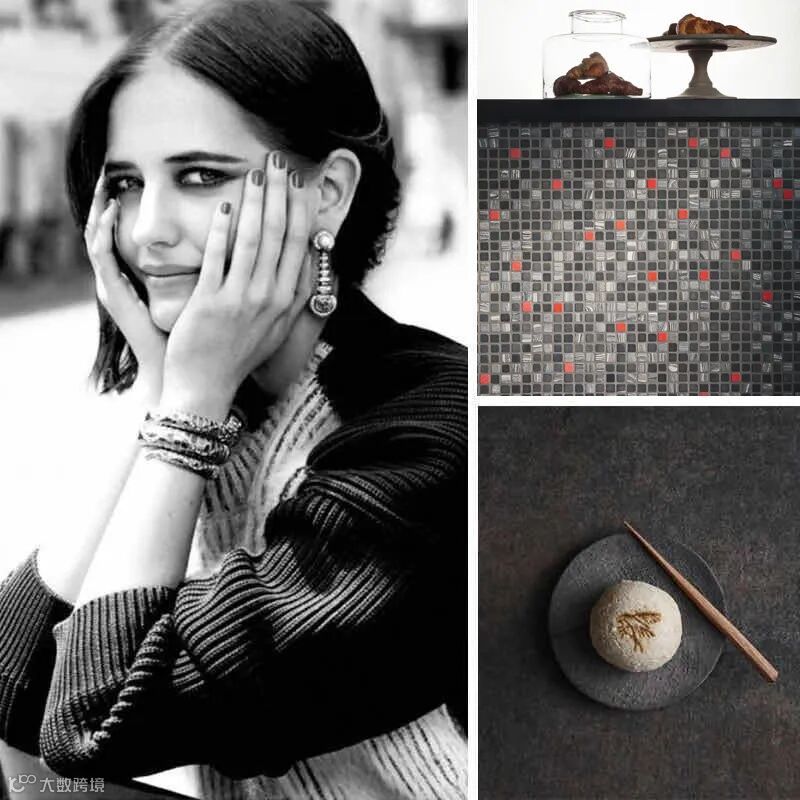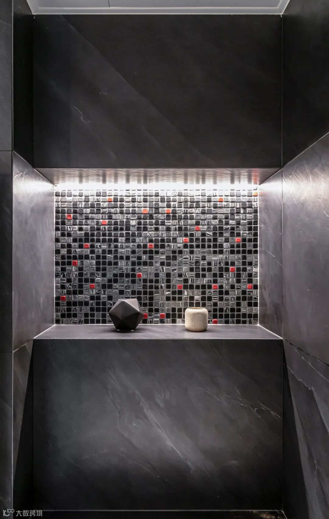 黑红、条纹块状马赛克块状砖体给人一种现代的律动感,在光的照射下,不同角度的光线映在亮面砖体上,呈现出一种波光粼粼的美。