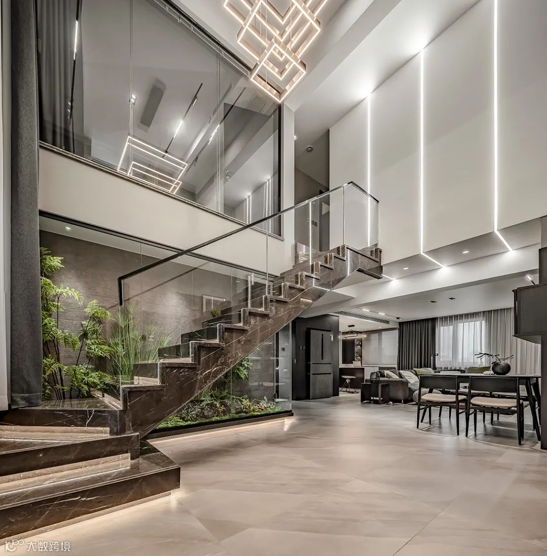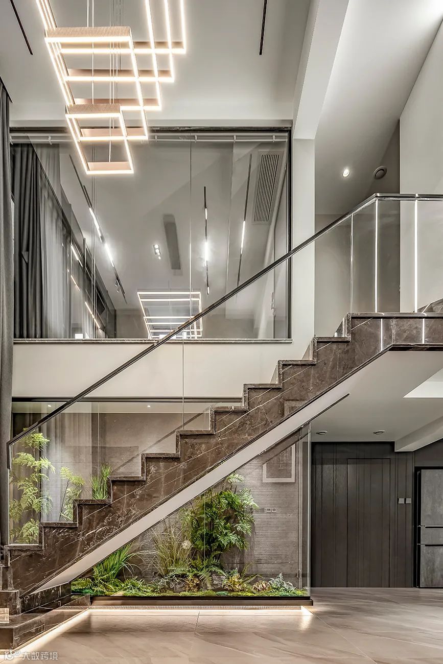 楼梯处,设计师将原有楼梯位置从房子中间改到了进门入户挑空处,并在楼梯侧面增加绿植玻璃墙,这样既解决了楼梯无法贴墙问题,还为空间增添了一抹绿意与生气。