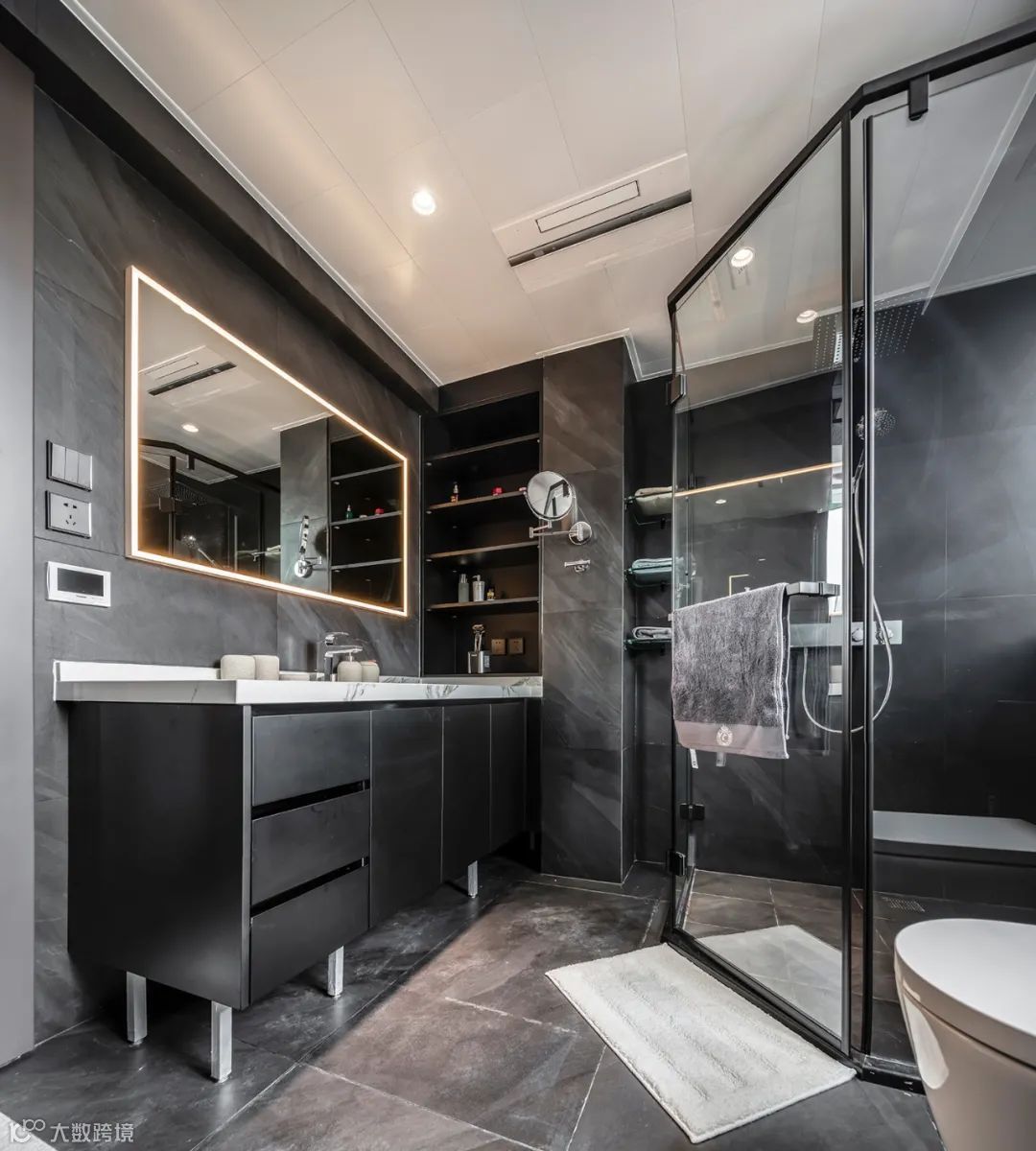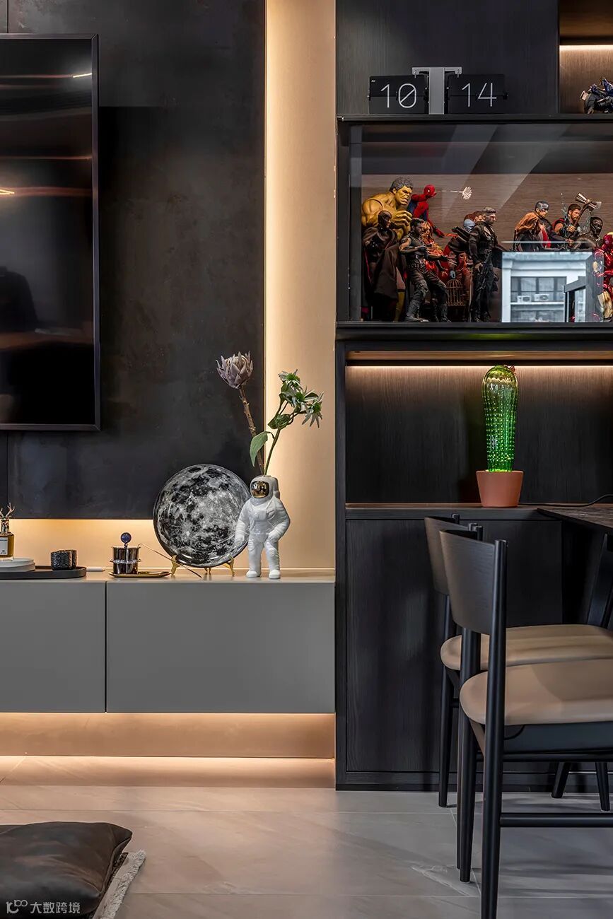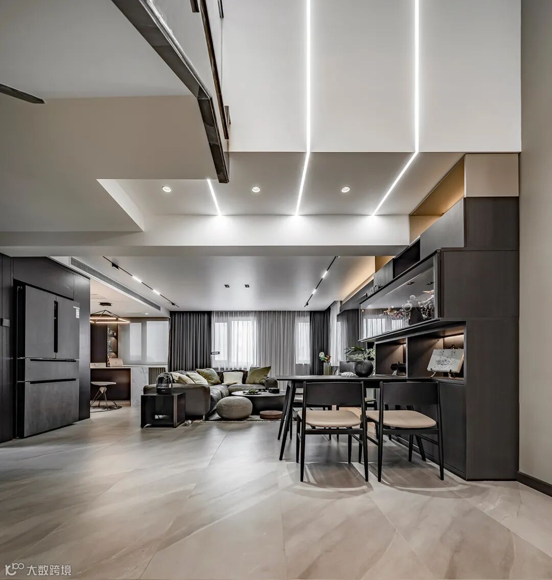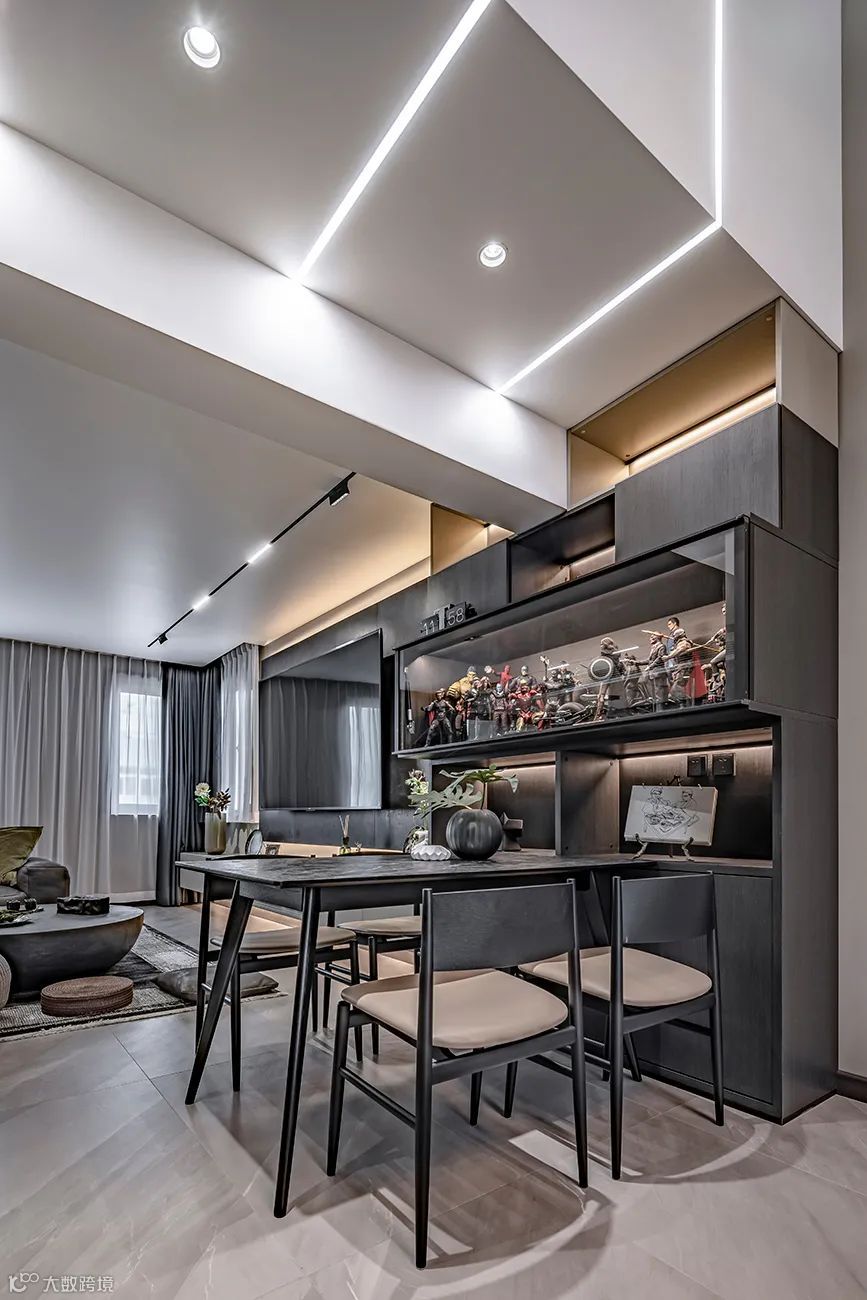 餐区,灯光从顶延伸到柜面,镜柜中暖暖光线晕开空间冰冷,将家的温度丝丝沁入其间。