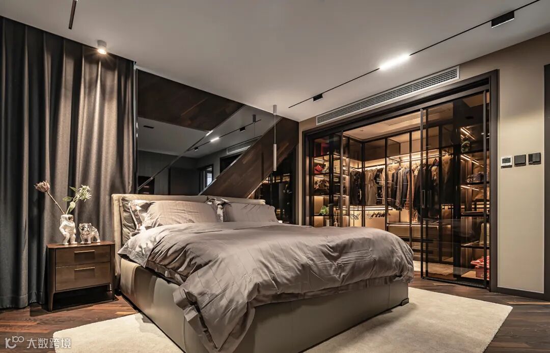 主卧内嵌小型衣帽间,玻璃材质茶色衣帽间设计更讲究整体性,便捷式推拉门为业主带来更多便利。