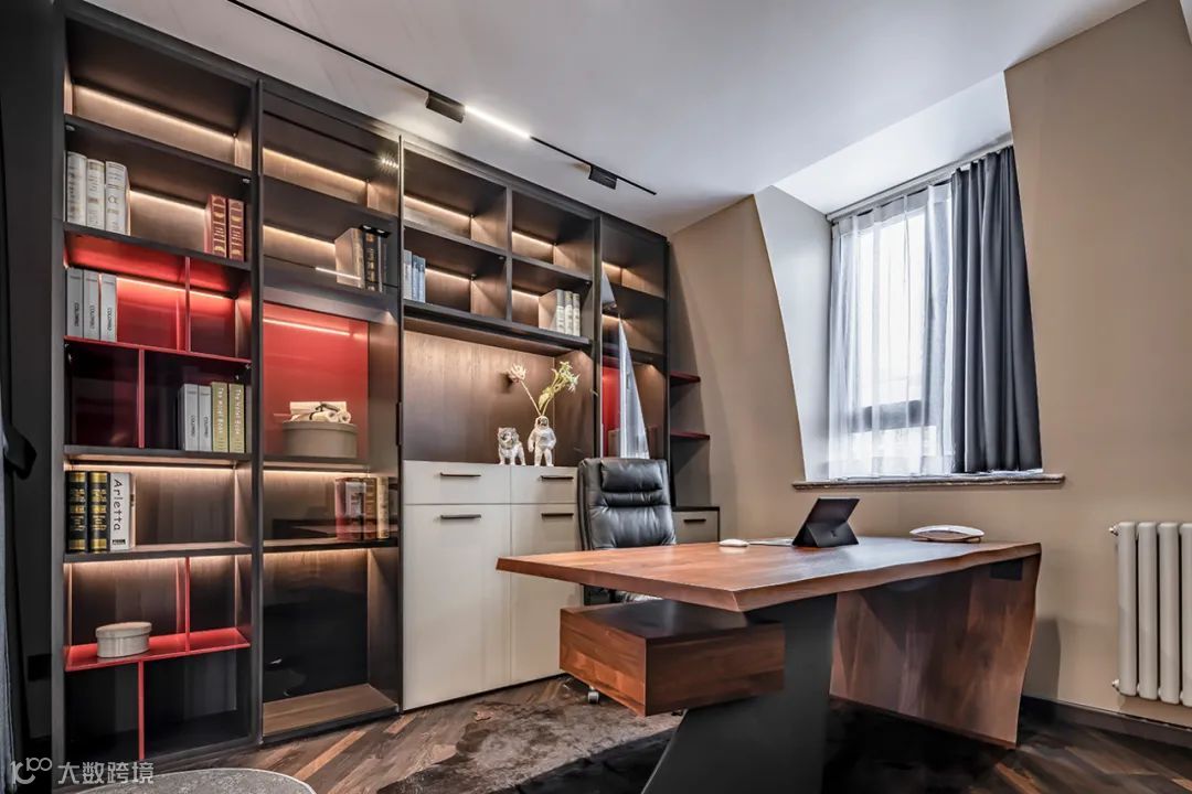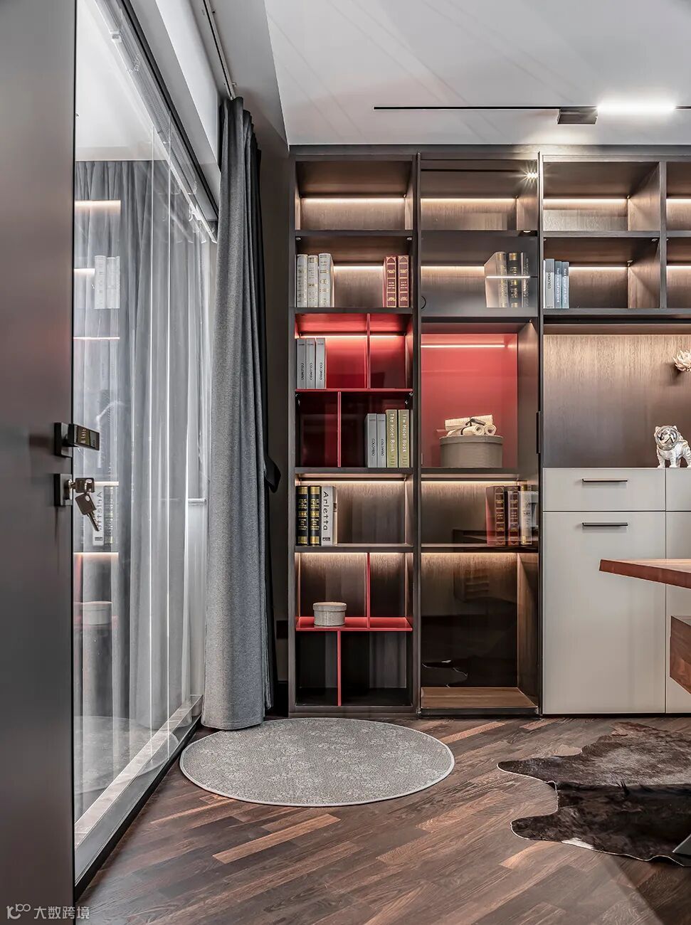 为实现视觉更大的通透性,设计师为书房打造了一面落地玻璃墙。