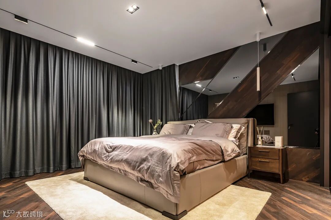 床头烤漆背景墙与木纹背景墙搭配,大块几何结构,设计感十足又无比实用。